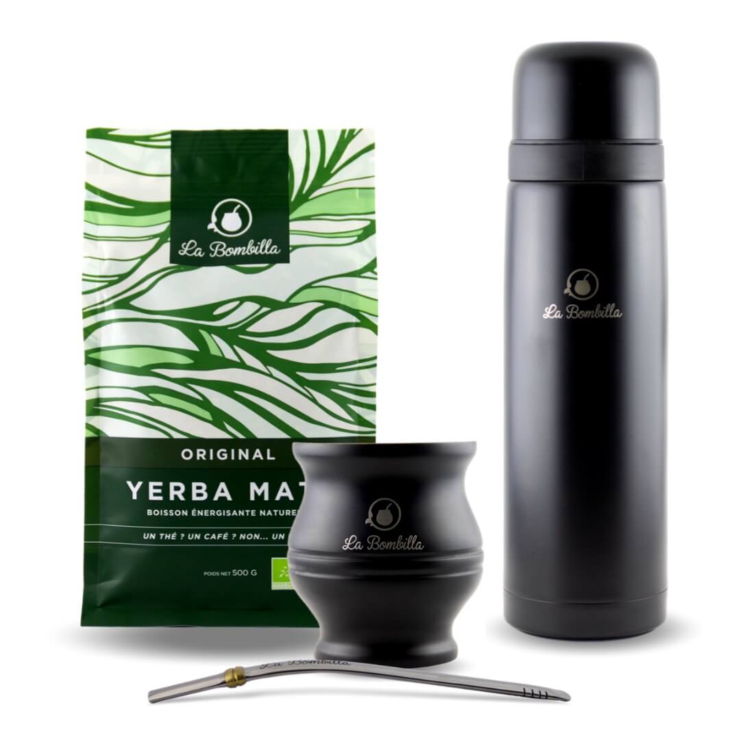 Il contient tous les essentiels pour découvrir le maté : Maté Original 500g, Calebasse noire Inox, Bombilla Signature, Thermos à maté.